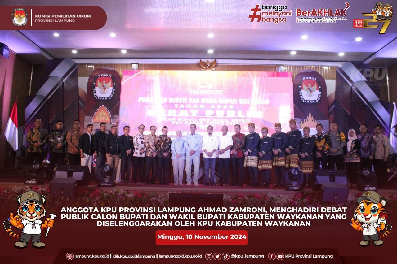Anggota KPU Provinsi Lampung (Ketua Divisi Perencanaan dan Logistik), Ahmad Zamroni, menghadiri Debat Publik Calon Bupati dan Wakil Bupati Kabupaten Waykanan yang diselenggarakan oleh KPU Kabupaten Waykanan bertempat di Gedung Serbaguna Kabupaten Waykanan.