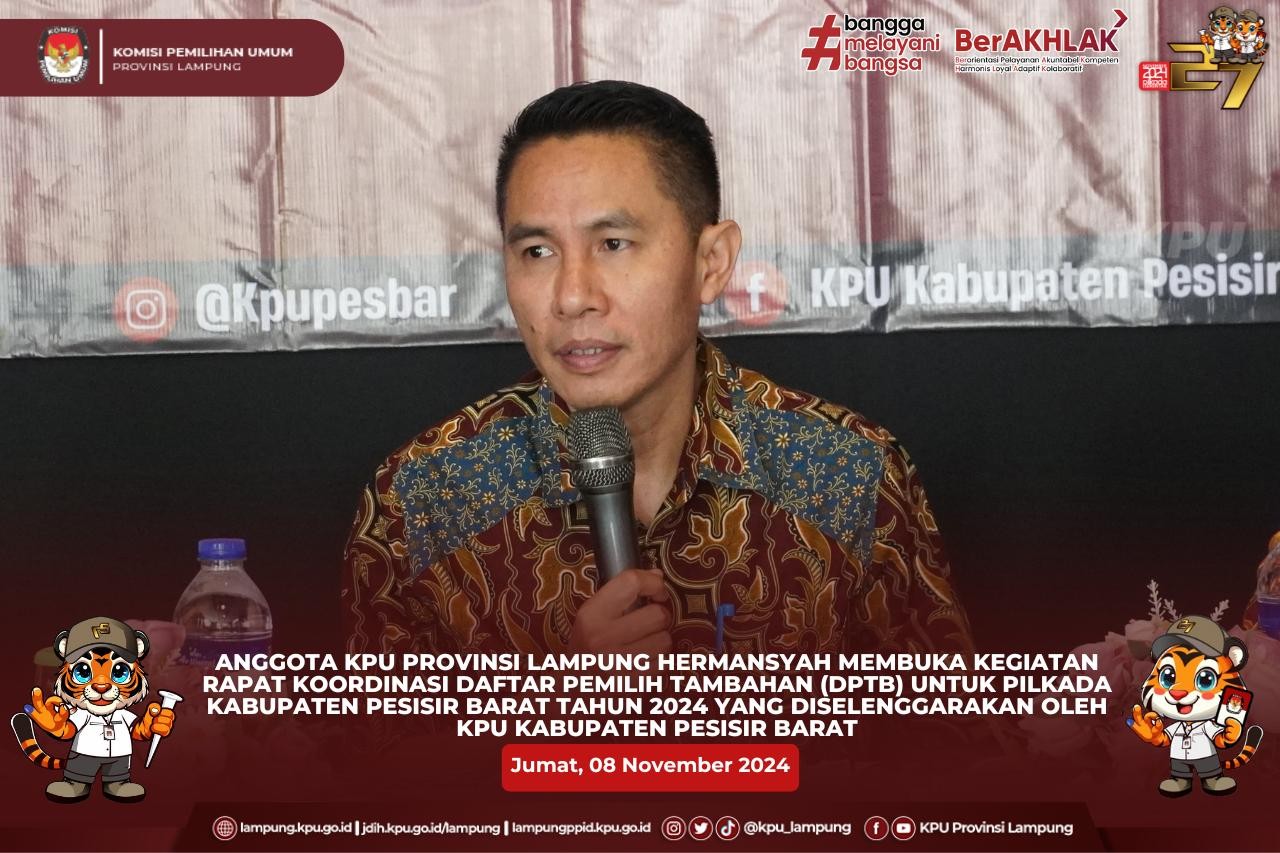 Pada kesempatan ini Febri Indra Kurniawan menyampaikan tentang pentingnya acara peningkatan kapasitas untuk satuan pengamanan dalam di lingkungan KPU Se-Provinsi Lampung ini, maka febri berharap kepada peserta untuk serius mengikuti kegiatan ini agar kesiapan mental dan fisik dapat bertambah dalam rangka menyukseskan Pemilihan Serentak, 27 November 2024 mendatang.