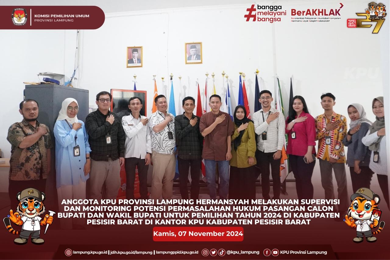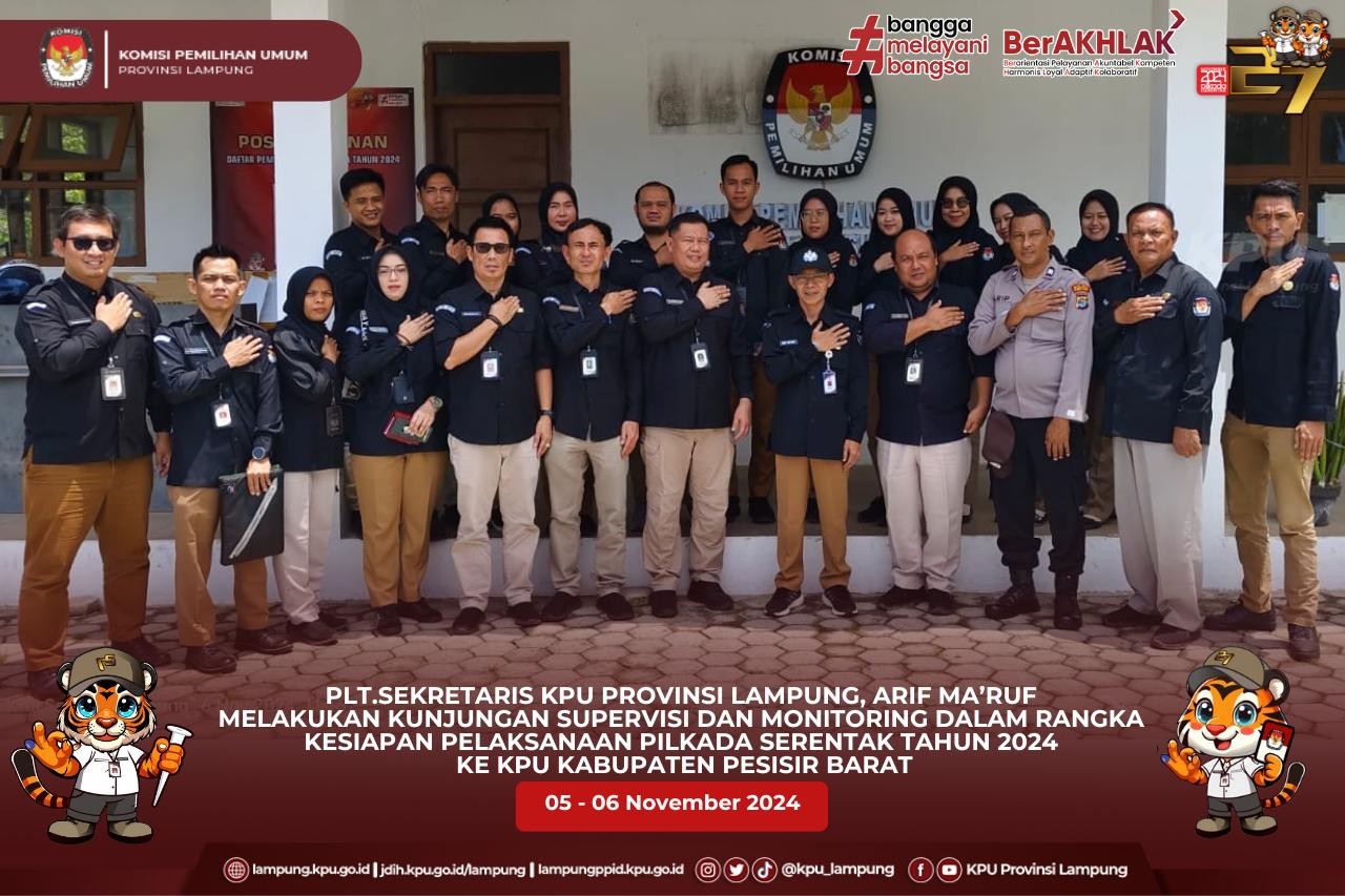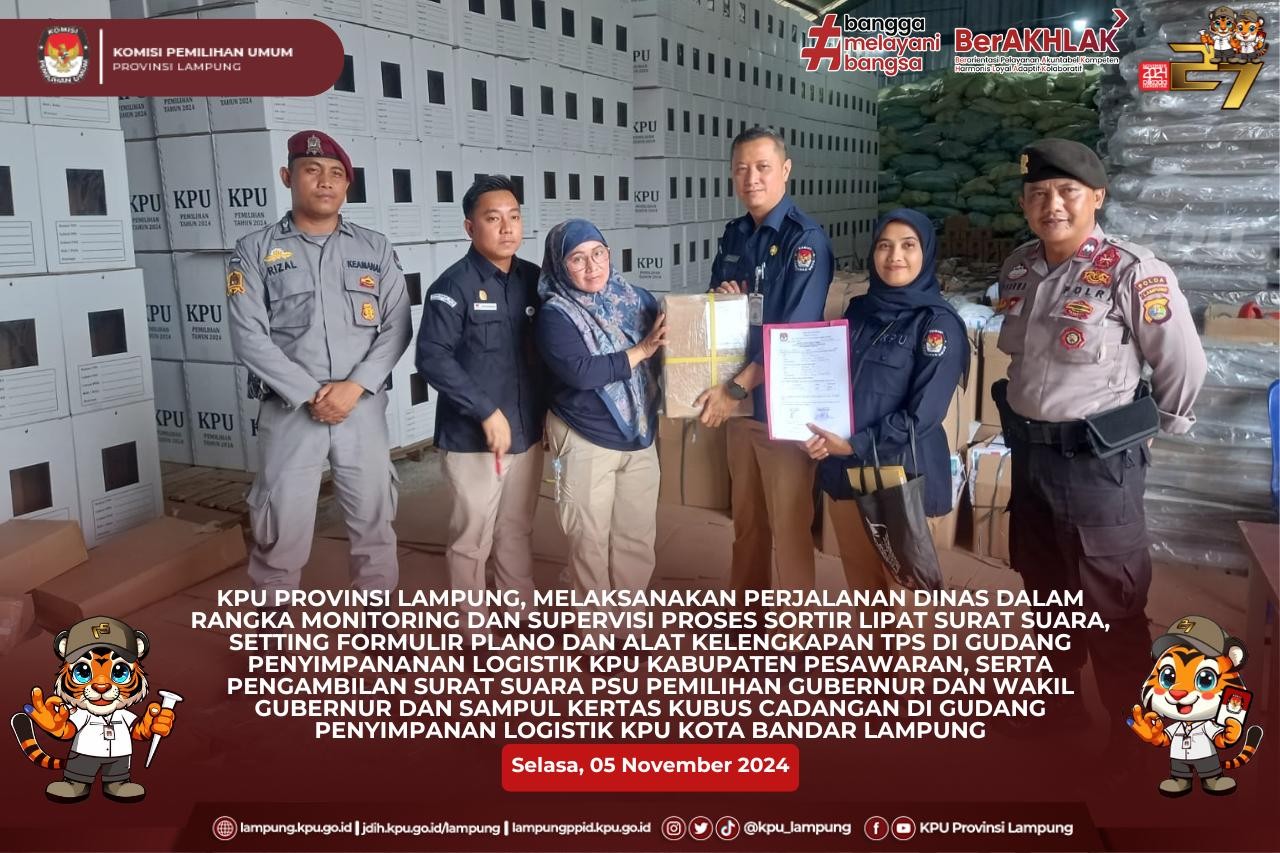 Plh. Kabag. Keuangan Umum dan Logistik KPU Provinsi Lampung, Bapak Azriando Cahya Negara, Tim Logistik, Pamdal KPU Provinsi Lampung dan Personil Pengamanan dari Polda Lampung melaksanakan perjalanan dinas dalam rangka monitoring dan supervisi proses sortir lipat surat suara, setting Formulir Plano dan Alat Kelengkapan TPS di Gudang Penyimpananan Logistik KPU Kabupaten Pesawaran, serta pengambilan Surat Suara PSU Pemilihan Gubernur dan Wakil Gubernur dan Sampul Kertas Kubus Cadangan di Gudang Penyimpanan Logistik KPU Kota Bandar Lampung.