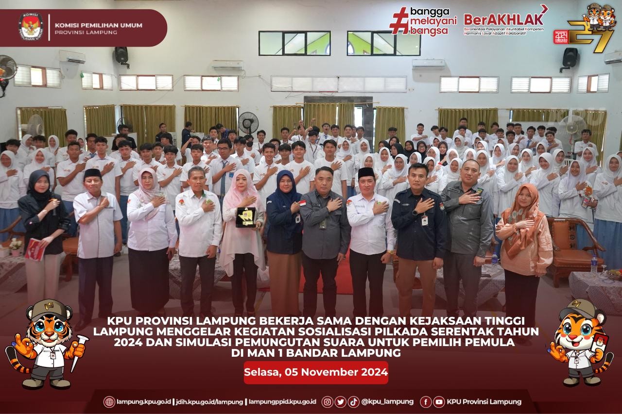 KPU Provinsi Lampung bekerja sama dengan Kejaksaan Tinggi Lampung menggelar Kegiatan Sosialisasi Pilkada Serentak Tahun 2024 dan Simulasi Pemungutan Suara untuk Pemilih Pemula di MAN 1 Bandar Lampung.
