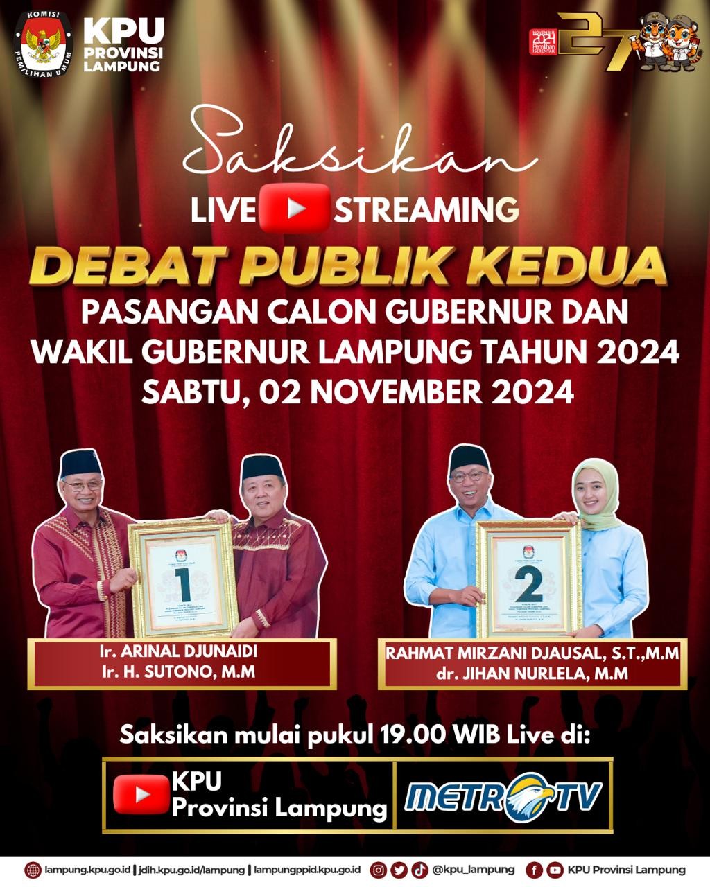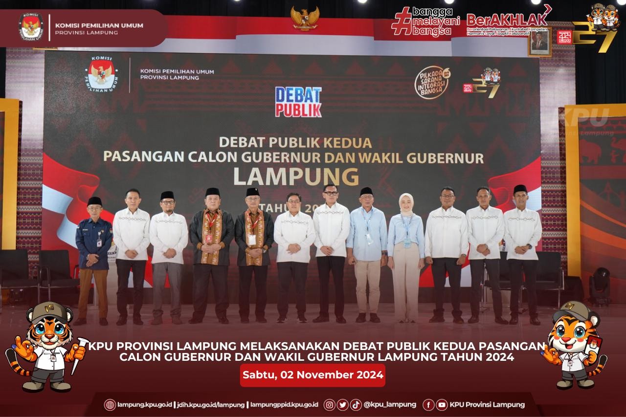 (Sabtu, 02 November 2024) KPU Provinsi Lampung melaksanakan Debat Publik Kedua Pasangan Calon Gubernur dan Wakil Gubernur Lampung Tahun 2024 yang bertempat di Hotel Novotel Bandar Lampung. Debat kedua ini dipadu oleh dua moderator, Iqbal Himawan dan Naila Husna, dengan tema yang mencakup aspek hukum, pemerintahan, sosial, dan budaya dan ditayangkan secara live melalui kanal Youtube KPU Provinsi Lampung dan Metro TV yang dimulai pukul 19.00 WIB. Pada kesempatan ini Ketua KPU Provinsi Lampung, Erwan Bustami, mengatakan dengan pasangan calon gubernur dan wakil gubernur menyampaikan adu gagasan antar paslon ini dapat memberikan gambaran kepada masyarakat Lampung sebelum menggunakan hak suaranya pada 27 November 2024. Debat kedua ini menghadiri dua Pasangan Calon Gubernur dan Wakil Gubernur Lampung Tahun 2024 yakni, Pasangan Calon Nomor Urut 1 Ir. Arinal Djunaidi dan Ir. H. Sutono, M.M serta Pasangan Calon Nomor Urut 2 Rahmat Mirzani Djausal, S.T.,M.M dan dr. Jihan Nurlela, M.M. Debat kedua ini dihadiri oleh Panelis yang terdiri dari sejumlah akademisi terkemuka, termasuk Guru Besar Administrasi Negara Universitas Lampung, Yuliato, Guru Besar UIN Raden Intan Lampung, Iriana Fane, Guru Besar Ilmu Hukum Universitas Lampung, Rudy, Wakil Dekan Bidang Kemahasiswaan dan Kerjasama Fisip Universitas Lampung, Robi Cahyadi Kurniawan, Institut Teknologi Sumatera, Asnaini , dan Fakultas Hukum Universitas Bandar Lampung Zulfi Diane Zaini. Turut hadir Kapolres Bandar Lampung, Perwakilan Korem 043/Gatam, Perwakilan BNN Provinsi Lampung, Ketua dan Anggota Bawaslu Provinsi Lampung, Ketua KPU Kabupaten/Kota, Pendukung kedua pasangan calon Gubernur dan Wakil Gubernur