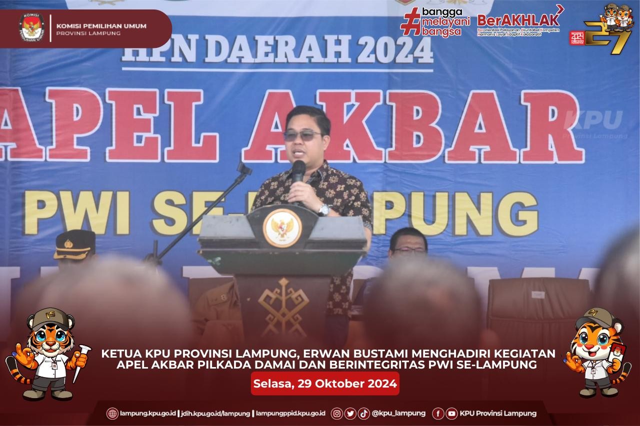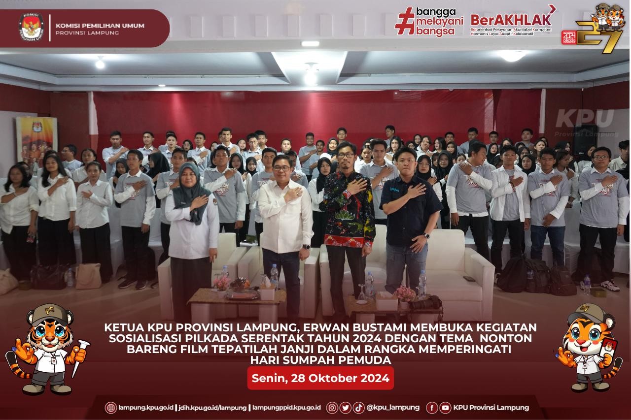 Ketua KPU Provinsi Lampung, Erwan Bustami membuka kegiatan sosialisasi pilkada serentak tahun 2024 dengan tema nonton bareng film Tepatilah Janji dalam rangka memperingati hari Sumpah Pemuda, Kegiatan ini bertempat di Gedung D Hukum Universitas Lampung.