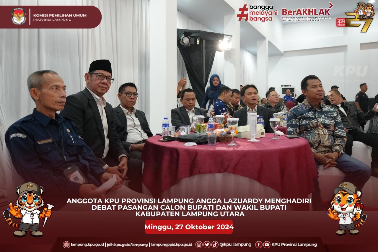 (Minggu, 27 Oktober 2024) Anggota KPU Provinsi Lampung (Ketua Divisi SDM dan Litbang), Angga Lazuardy didampingi oleh Kepala Bagian Teknis Penyelenggaraan Pemilu, Partisipasi dan Hubungan Masyarakat Yustian Umri Sangon menghadiri Debat Pasangan Calon Bupati dan Wakil Bupati Kabupaten Lampung Utara bertempat di Aula Universitas Kotabumi (UMko) Lampung Utara. Debat pertama ini mengusung Tema “Pelayanan Publik dan Kesejahteraan Masyarakat” yang menghadirkan dua pasangan Calon Bupati dan Calon Wakil Bupati Lampung Utara Tahun 2024, yakni pasangan nomor urut 1 Hamartoni Ahadis dan Romli serta pasangan nomor urut 2 Ardian Saputra dan Sofyan. pada kesempatan ini Angga Lazuardy menyampaikan apresiasi atas terselenggaranya Debat Kandidat Bupati dan Wakil Bupati Kabupaten Lampung Utara yang dilaksanakan oleh KPU Kabupaten Lampung Utara. Angga menyampaikan bahwa pelaksanaan debat kandidat oleh pasangan calon Kepala Daerah diselenggarakan dalam rangka mensosialisasikan Pemilihan Serentak yang akan dilaksanakan pada 27 November 2024 nanti kepada masyarakat khususnya di Kabupaten Lampung Utara, kegiatan ini juga dilaksanakan agar masyarakat dapat mengetahui visi, misi serta gagasan para pasangan calon kepala daerah di Kabupaten Lampung Utara. turut hadir Ketua KPU Kabupaten Lampung Utara, Marswan Hambali serta Anggota KPU Kabupaten Lampung Utara Yansen Atik, Tedi Yunada, dan Aprizal Ria serta Sekretaris KPU Kabupaten Lampung Utara Horizon, Forkopimda Plus serta tamu undangan yang telah ditentukan.