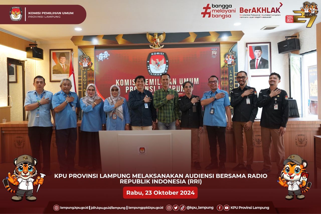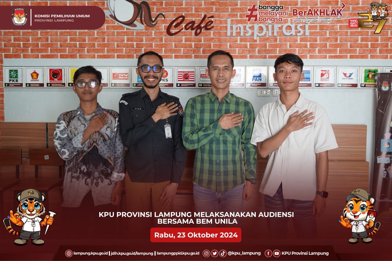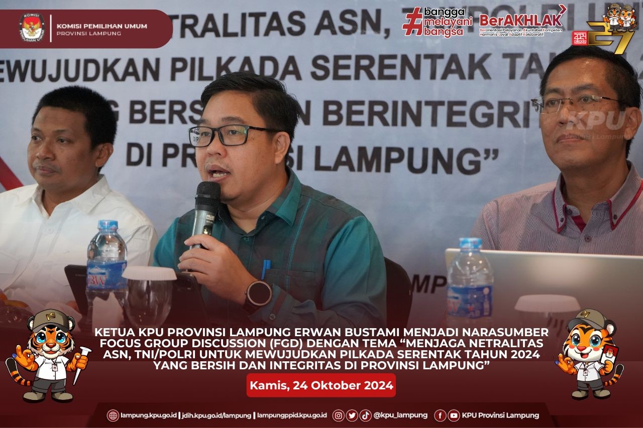 Ketua KPU Provinsi Lampung, Erwan Bustami menghadiri undangan sebagai pemateri dalam kegiatan Focus Group Discussion (FGD) dengan tema “Menjaga Netralitas ASN, TNI/POLRI untuk Mewujudkan Pilkada Serentak Tahun 2024 yang Bersih dan Berintegritas di Provinsi Lampung” yang diselenggarakan oleh Polda Lampung di Hotel Arte, Bandar Lampung.