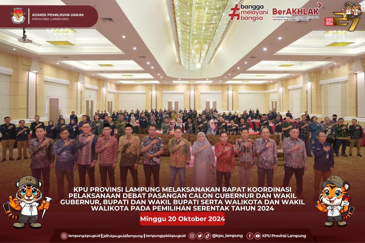 (20 Oktober 2024) KPU Provinsi Lampung melaksanakan Rapat Koordinasi Pelaksanaan Debat Publik Pasangan Calon Gubernur dan Wakil Gubernur, Bupati dan Wakil Bupati serta Walikota dan Wakil Walikota pada Pemilihan Serentak Tahun 2024 dihotel Swissbell Bandar Lampung.