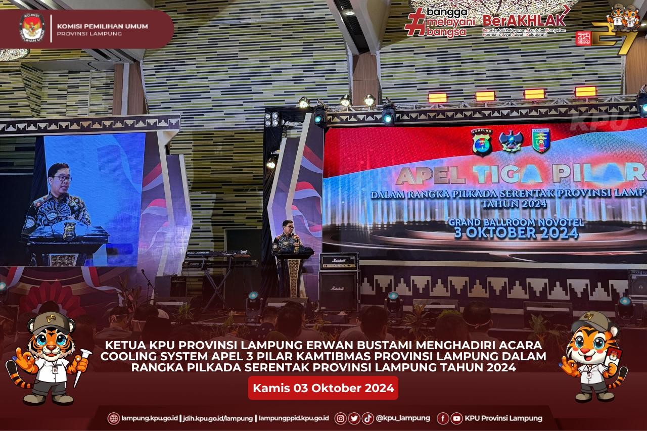 (Kamis 03 Oktober 2024) Ketua KPU Provinsi Lampung Erwan Bustami menghadiri acara Cooling System Apel 3 Pilar Kamtibmas Provinsi Lampung dan Mitra Kamtibmas Polda Lampung, di Ballroom Hotel Novotel, Bandar Lampung.