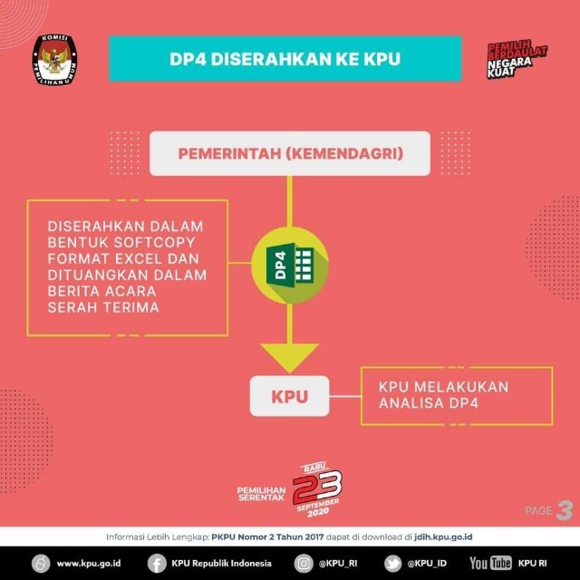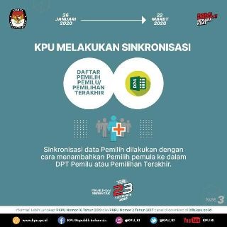 Tahukah KAMU. tentang SINKRONISASI DP4 ? Apa itu Sinkronisasi DP4 ? Sinkronisasi adalah upaya menyandingkan dua data yang dimiliki oleh Kemendagri berupa Daftar Penduduk Potensial Pemilih Pemilihan (DP4) dengan data yang dimiliki oleh KPU yaitu data DPT (Daftar Pemilih Tetap) pemilu atau pemilihan terakhir. Perlu diketahui dan dipaham bahwa DP4 berisi data penduduk yang telah memenuhi syarat sebagai pemilih pada saat hari pemungutan suara diselenggarakan. Sedangkan DPT adalah data pemilih pemilu atau pemilihan terakhir yang sudah berdasarkan penempatan lokasi Tempat Pemungutan Suara (TPS) sesuai dengan alamat domisili pemilih. Dua data ini (DP4 dan DPT terakhir) disingkronkan untuk mendapatkan data pemilih sebagai bahan untuk pemutakhiran secara faktual di lapangan pada saat masa coklit (pencocokan dan penelitian) oleh Petugas Pemutakhiran Data Pemilih (PPDP). Sinkronisasi data pemilih (DP4) dilakukan dengan cara menambahkan data pemilih pemula ke dalam DPT Pemilu atau Pemilihan Terakhir. Kapan waktu dilakukan sinkronisasi ? Masa sinkronisasi data pemilih antara DP4 dan DPT Pemilu atau Pemilihan terakhir dilakukan dari tanggal 26 Januari 2020 sampai dengan tanggal 22 Maret 2020 (selama 57 hari) setelah DP4 diterima oleh KPU RI dari Menteri Dalam Negeri (Mendagri) pada tanggal 23 - 25 Januari 2020. Setelah proses sinkronisasi selesai dilakukan terhadap DP4 oleh KPU RI, maka KPU RI akan melakukan dua hal yaitu : 1). menyampaikan hasil analisis dan sinkronisasi DP4 dkepada KPU Propinsi dan KPU Kabupaten/Kota. 2). mengumumkan hasil analisis dan sinkronisasi kepada masyarakat. Adapun waktu penyampaian dan pengumuman hasil sinkronisasi DP4 dengan DPT Pemilu atau Pemilihan Terakhir yaitu pada tanggal 21 - 23 Maret 2020. Agus Riyanto (Divisi Data dan Informasi KPU Provinsi Lampung Periode 2019 - 2024) #PilkadaSerentak2020 #KPUMelayani