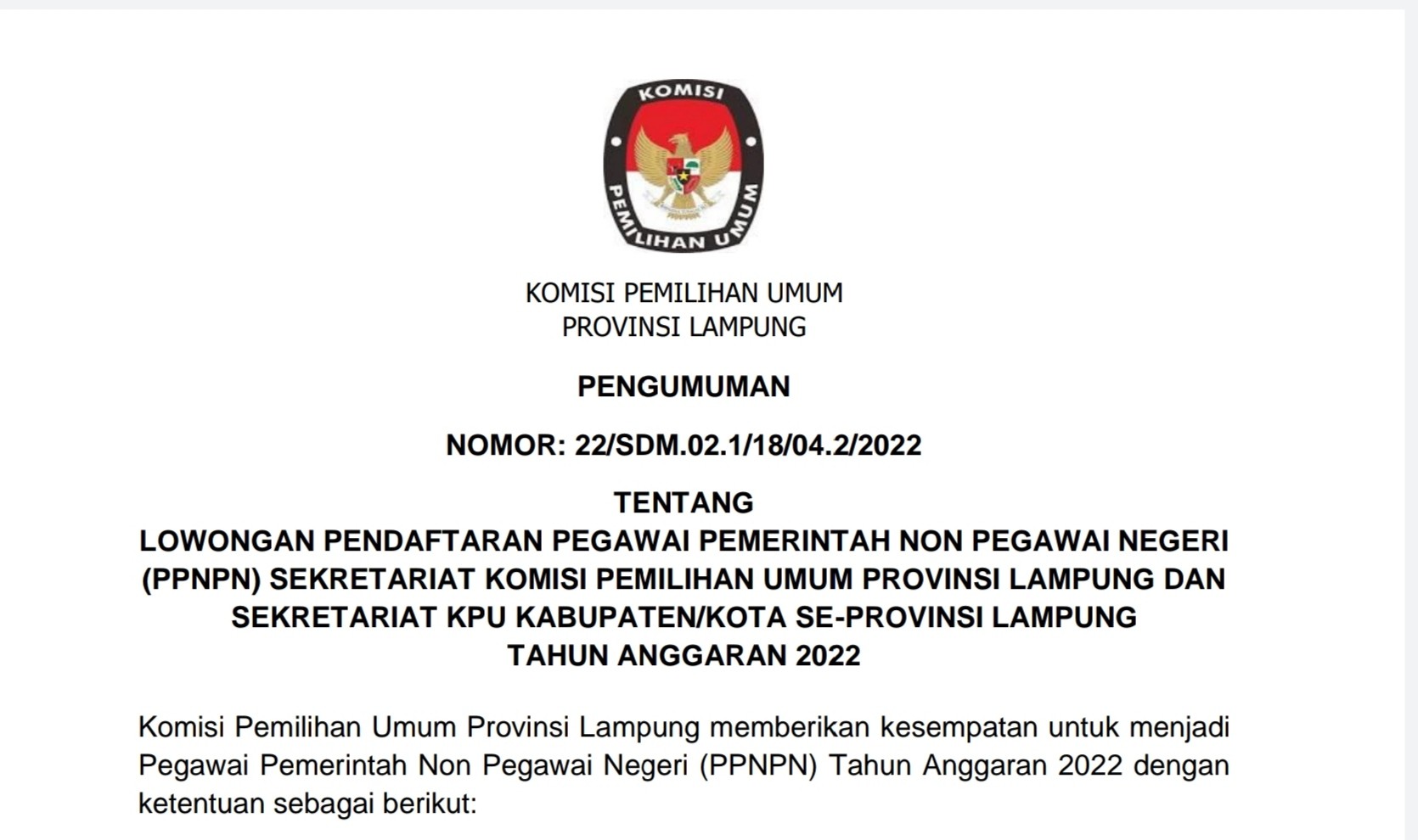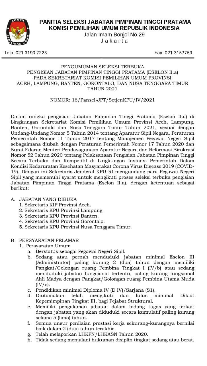 Dalam rangka pengisian Jabatan Pimpinan Tinggi Pratama (Eselon II.a) di Lingkungan Sekretariat Komisi Pemilihan Umum Provinsi Aceh, Lampung, Banten, Gorontalo dan Nusa Tenggara Timur Tahun 2021, sesuai dengan Undang-Undang Nomor 5 Tahun 2014 tentang Aparatur Sipil Negara, Peraturan Pemerintah Nomor 11 Tahun 2017 tentang Manajemen Pegawai Negeri Sipil sebagaimana diubah dengan Peraturan Pemerintah Nomor 17 Tahun 2020 dan Surat Edaran Menteri Pendayagunaan Aparatur Negara dan Reformasi Birokrasi Nomor 52 Tahun 2020 tentang Pelaksanaan Pengisian Jabatan Pimpinan Tinggi Secara Terbuka dan Kompetitif di Lingkungan Instansi Pemerintah. Selengkapnya klik disini