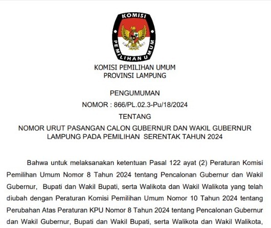 bahwa berdasarkan Berita Acara Komisi Pemilihan Umum Provinsi Lampung Nomor 420/PL.02.3-BA/18/2024 tanggal 22 September 2024 tentang Penetapan Pasangan Calon Peserta Pemilihan Gubernur dan Wakil Gubernur Lampung Tahun 2024;