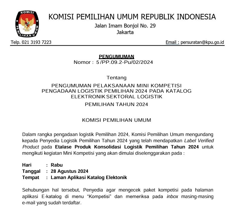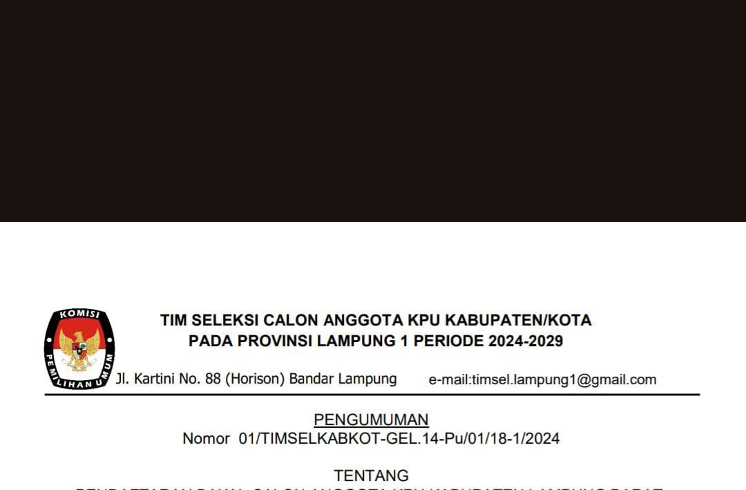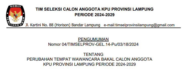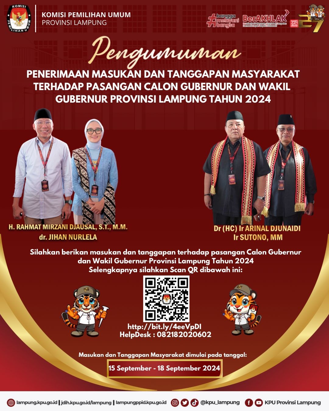 Bahwa untuk melaksanakan ketentuan Pasal 137 Peraturan KPU Nomor 8 Tahun 2024 tentang Pencalonan Gubernur dan Wakil Gubernur, Bupati dan Wakil Bupati, serta Walikota dan Wakil Walikota yang telah diubah dengan Peraturan KPU Nomor 10 Tahun 2024 tentang Perubahan Atas Peraturan KPU Nomor 8 Tahun 2024 tentang Pencalonan Gubernur dan Wakil Gubernur, Bupati dan Wakil Bupati, serta Walikota dan Wakil Walikota, Komisi Pemilihan Umum Provinsi Lampung mengumumkan Penerimaan Masukan dan Tanggapan Masyarakat terhadap Pasangan Calon Gubernur dan Wakil Gubernur Provinsi Lampung sebagai berikut: [Klik disini]