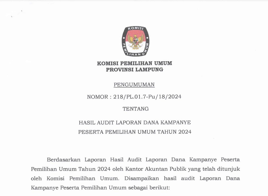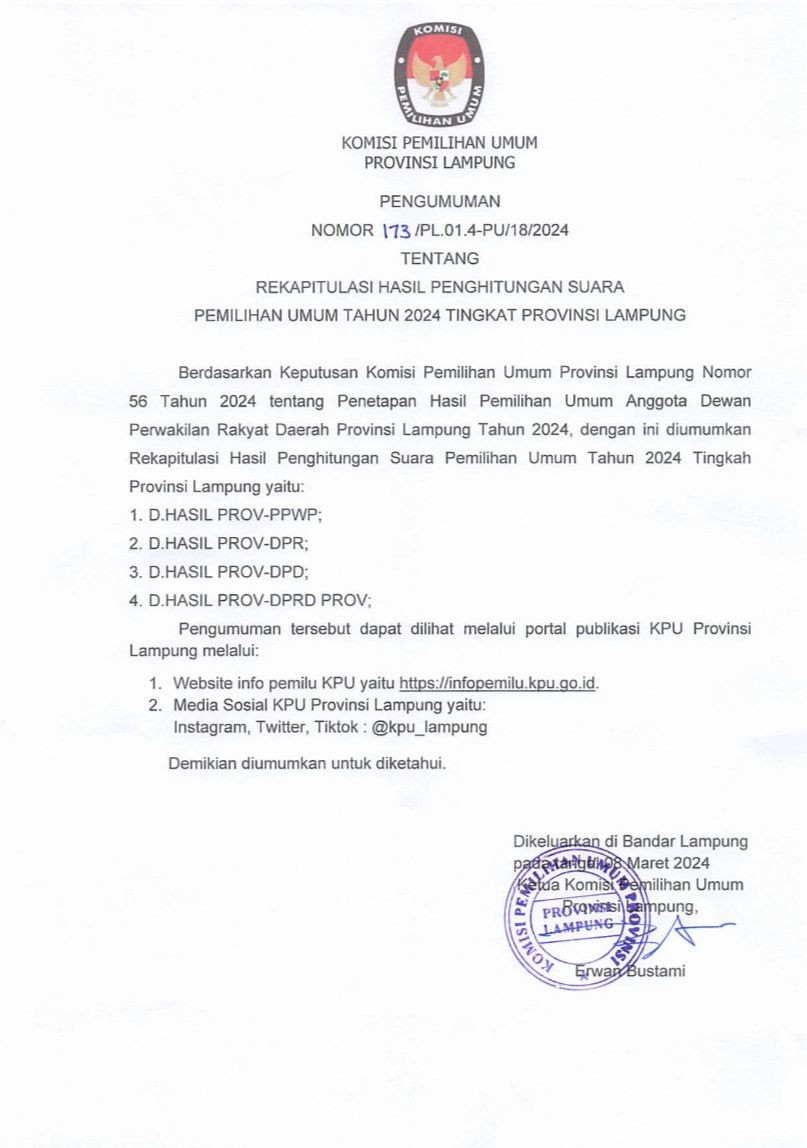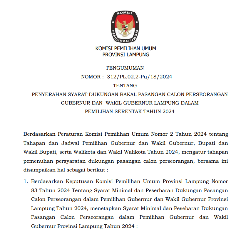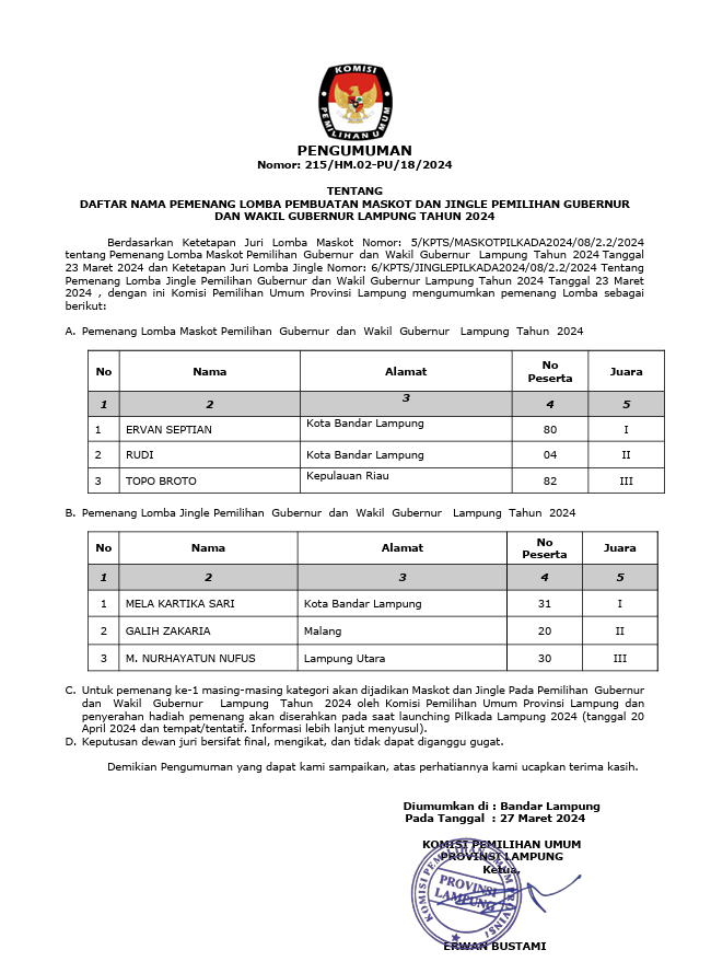 Berdasarkan Ketetapan Juri Lomba Maskot Nomor: 5/KPTS/MASKOTPILKADA2024/08/2.2/2024 tentang Pemenang Lomba Maskot Pemilihan Gubernur dan Wakil Gubernur Lampung Tahun 2024 Tanggal 23 Maret 2024 dan Ketetapan Juri Lomba Jingle Nomor: 6/KPTS/JINGLEPILKADA2024/08/2.2/2024 Tentang Pemenang Lomba Jingle Pemilihan Gubernur dan Wakil Gubernur Lampung Tahun 2024 Tanggal 23 Maret 2024 , dengan ini Komisi Pemilihan Umum Provinsi Lampung mengumumkan pemenang Lomba sebagai berikut: