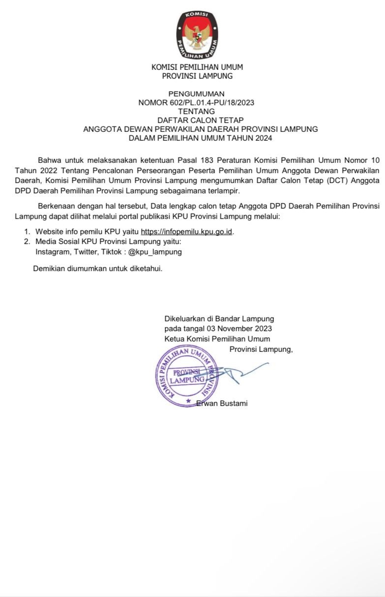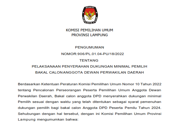 Komisi Pemilihan Umum Provinsi Lampung menerima pendaftaran Anggota Dewan Perwakilan Daerah Lampung, dengan ketentuan sebagai berikut: