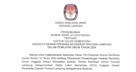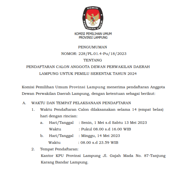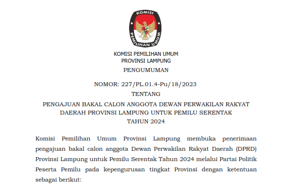 PENDAFTARAN CALON ANGGOTA DEWAN PERWAKILAN DAERAH LAMPUNG UNTUK PEMILU SERENTAK TAHUN 2024