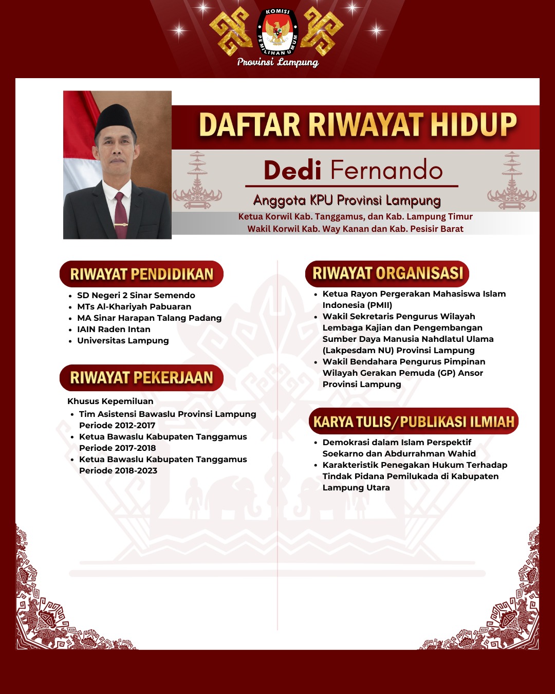 2. Dedi Fernando (Anggota KPU, Ketua Divisi Sosialisasi Pendidikan Pemilih dan Parmas) (Profil Lengkap Klik Disini)